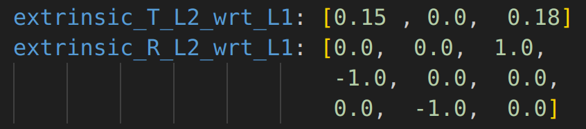 LiDAR2(front-mounted): This LiDAR is mounted on the front of the robot. Its pose relative to LiDAR1 is given by the extrinsic transformation as shown in Fig. 2. It outputs 10 Hz LiDAR point cloud( topic: /livox/lidar_10_192_1_123) and 200 Hz IMU data( topic: /livox/imu_10_192_1_123).