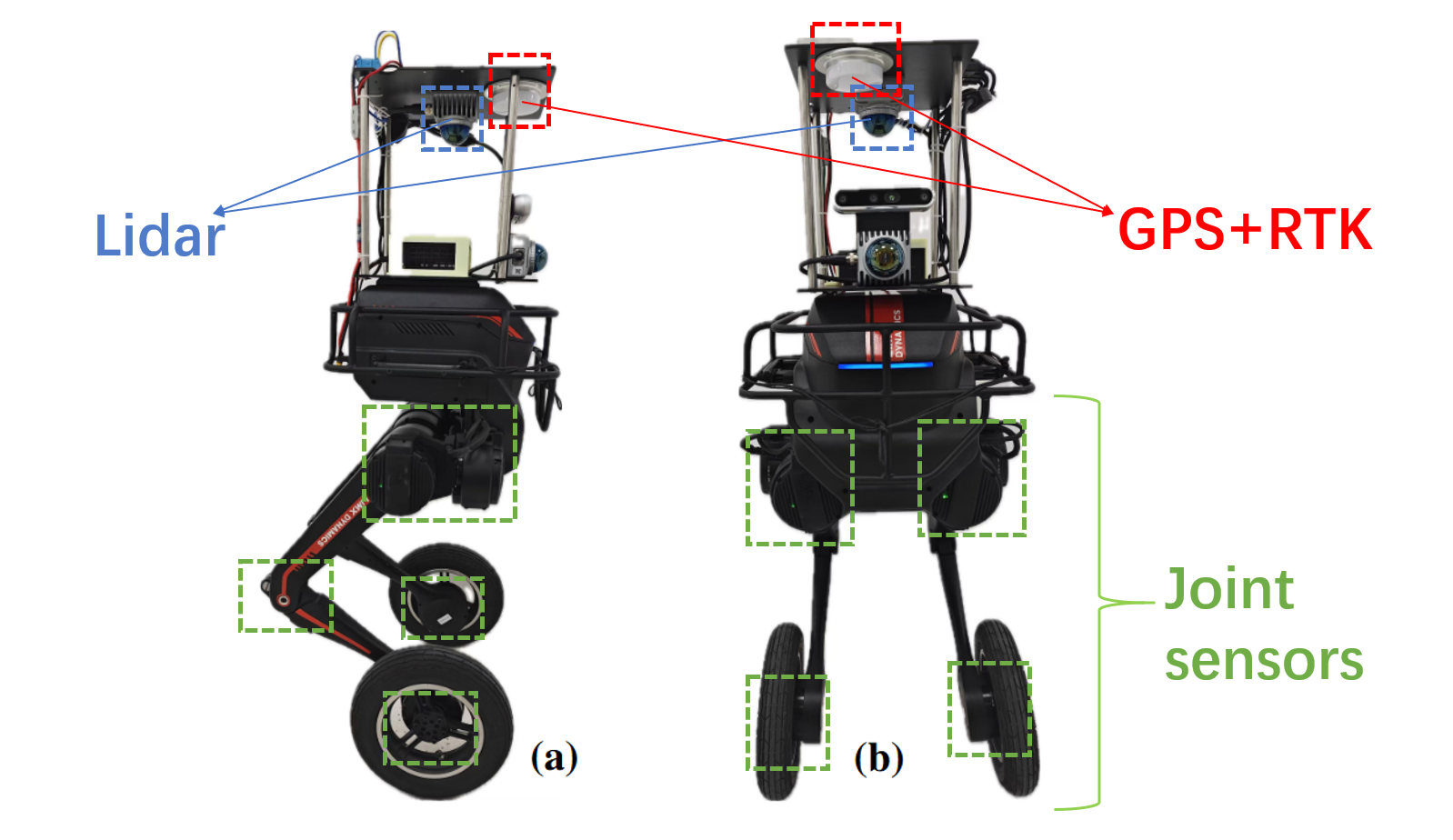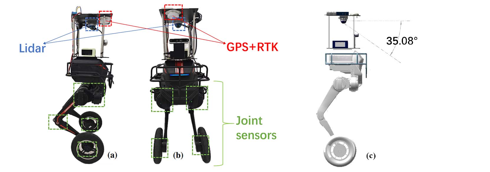 The legged-wheel robot we used to collect datasets is shown in Fig. 1. It’s equipped with 2 MID360 LiDAR, a BG-610M RTK GNSS, and a Realsense d435i RGB-D camera. Note that our datasets only include the LiDAR and IMU data from 2 MID360 LiDAR, the GPS-RTK data from RTK GNSS module and joints sensors data from the robot’s API. Data from d435i is not in the datasets.